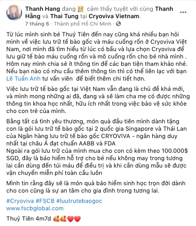 “Từ lúc mình sinh bé Thuỷ Tiên đến nay cũng khá nhiều bạn hỏi mình về việc lưu trữ tế bào gốc và máu cuống rốn ở Cryoviva Việt Nam, nơi mình đã tìm hiểu từ lúc có bầu và lựa chọn Cryoviva để lưu giữ tế bào máu cuống rốn và mô cuống rốn cho bé nhà mình.” – Chị Hằng chia sẽ trên trang Facebook cá nhân của mình